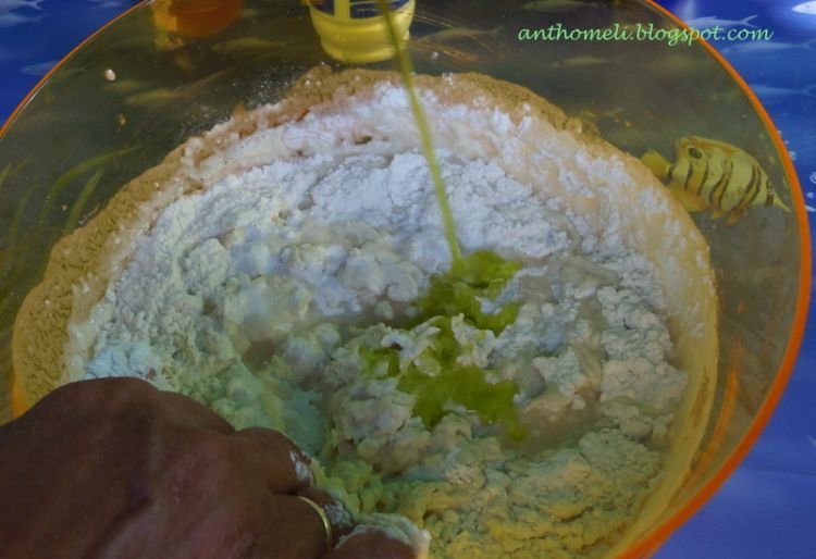 Προσθέτουμε το αλεύρι, το αλάτι, ένα “φσιτ” από το ξύδι ( έτσι μου το είπανε, έτσι σας το λέω), μια κ.σ. ελαιόλαδο και ζυμώνουμε μέχρι να γίνει μια ζύμη που δεν κολλάει στα χέρια.
