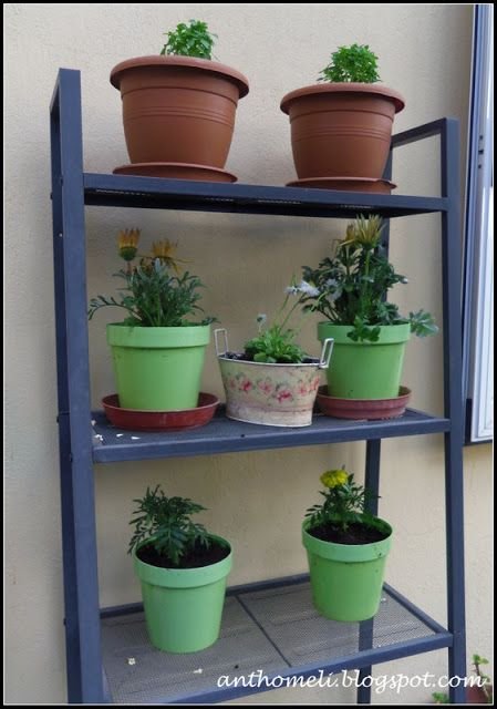 Να κι ένα ωραίο σημείο για γλαστρούλες. Πολύ φτηνή μεταλλική ραφιέρα από το IKEA. Σε αυτή την φώτο έχει λουλούδια αλλά αργότερα κάποιες από αυτές μπήκαν σαν παραπάνω ράφια κι εδώ τοποθετήθηκαν γλάστρες με μυρωδικά! Πρώτα όμως βάφτηκε με σπρέι για να αποκτήσει πιο φωτεινό χρώμα.