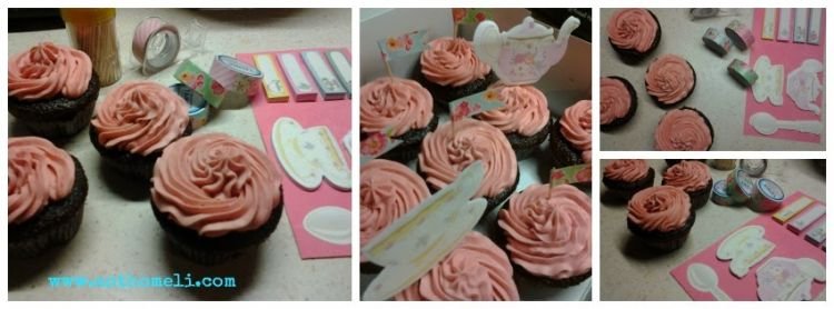Την ευχαριστώ επίσης θερμά γιατί είχε την καλή διάθεση να μας φτιάξει και cupcakes! Αφράτα και άκρως σοκολατένια στολισμένα με βουτυρόκρεμα από λευκή σοκολάτα! Από την μεριά μου, για να περάσουμε και πάλι στα του πάρτυ, το μόνο που έκανα είναι να τα στολίσω με σημαιάκια και μπανεράκια. Ο στολισμός τους έγινε πολύ απλά. Χρειάστηκα ψαλίδι, οδοντογλυφίδες, washi tape, και αυτοκόλλητα χαρτάκια που προμηθεύτηκα από το Happy Teapot!