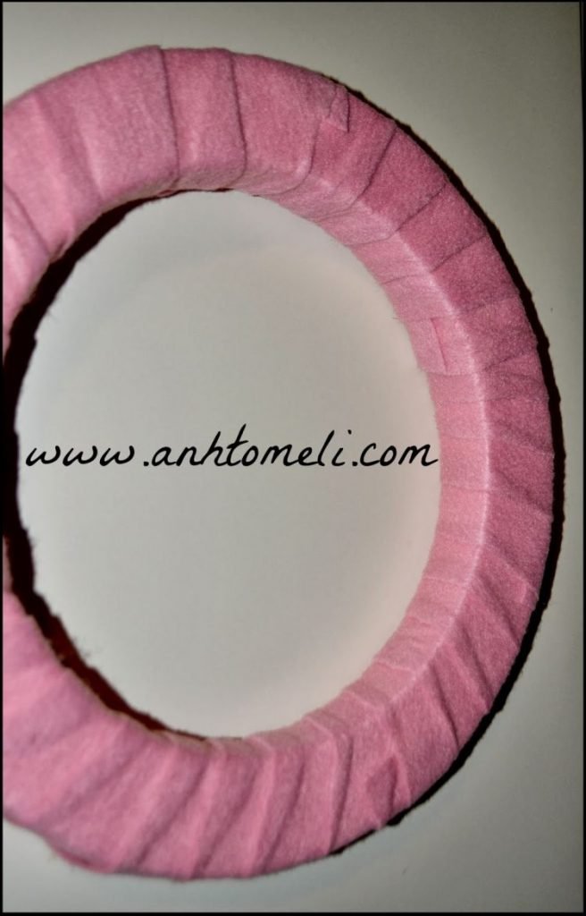 Αφού κόψετε την τσόχα σε λωρίδες, κολλήστε την άκρη της στο στεφάνι (με απλή κόλα ή με ζεστή σιλικόνη) και αρχίστε να τυλίγετε περιμετρικά…. ώσπου να το καλύψτε ολόκληρο.