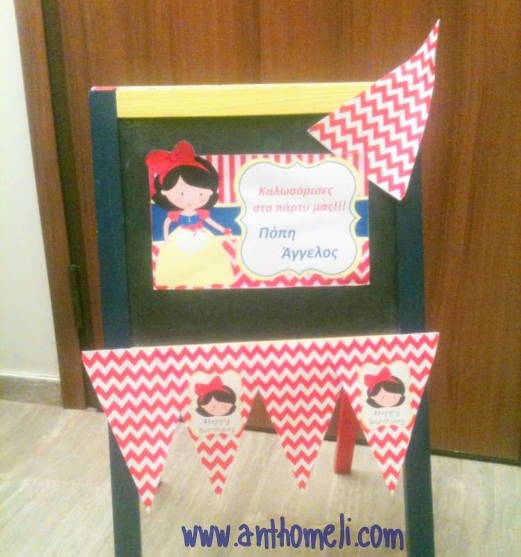 Κατ’ αρχάς πολλούς μήνες πριν ξεκίνησε η αναζήτηση στο internet. Πολλές ιδέες τις πήρε φυσικά από το δικό μας site και το αναλυτικότατο και περιεκτικότατο άρθρο του Ανθομέλι με ιδέες για πάρτυ! Επίσης από το pinterest αλλά και το google αναζητώντας πάρτυ με θέμα την Χιονάτη! Όλες αυτές τις πληροφορίες τις αποθήκευε και μόλις πλησίαζε ο καιρός κατέληξε στις πιο αγαπημένες και φαντάζομαι πιο πραγματοποιήσιμες! Έπρεπε να ξέρει τι θα εκτυπώσει, πως θα τα προσαρμόσει, τι θα ράψει, τι θα κολλήσει, τι θα περιλαμβάνει ο μπουφές, τι δωράκια θα προσφέρει τα παιδιά και άλλα πολλά… Ας αφήσω όμως την ίδια να μας τα περιγράψει αναλυτικά: