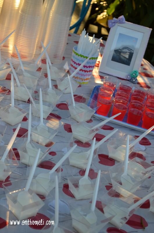 Το προηγούμενο βράδυ είχα προνοήσει να ετοιμάσω ζελεδάκια με γεύση κεράσι και λίγο πριν το πάρτυ σερβίραμε στα κουταλάκια την βανίλια-υποβρύχιο (λόγω της ζέστης όμως έφυγε από τα κουταλάκια). Φέτος τα μικρά ζελεδάκι ήταν το highlight του μπουφέ! Δεν τους προλάβαινα μικρούς και μεγάλους!