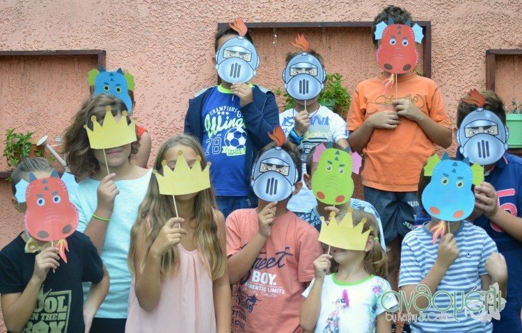 Πάντα στα πάρτυ μας επιδιώκω να κάνω μια αναμνηστική ομαδική φωτογράφιση. Την προηγούμενη μέρα εκτύπωσα σε λεπτά χαρτόνια μάσκες δράκων και ιπποτών αλλά και κορώνες για τα κορίτσια τα οποία κόψαμε με τα παιδιά, τους κολλήσαμε από πίσω ένα ξυλάκι από σουβλάκι κι έτοιμα τα photo props!