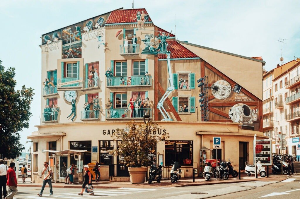 Το Cine Cannes. Το σπίτι των αστέρων. Κοιτάξτε προσεκτικά και θα δείτε τους Leonardo Di Caprio και Kate Winslet, Fred Astaire και Ginger Rogers, Charlie Chaplin, Batman, Superman, Jean-Paul Belmondo, Gérard Depardieu, Laurel and Hardy και άλλους. Ο παραπάνω πίνακας γιορτάζει τα 100 χρόνια κινηματογράφου, με φώτα, κάμερα και δράση