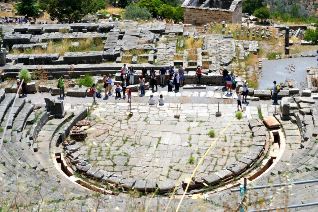 Εδώ κατά την αρχαιότητα διεξάγονταν μουσικοί αγώνες, παίζονταν θεατρικές παραστάσεις στα Πύθια, αλλά και στις διάφορες άλλες θρησκευτικές γιορτές. Από αυτό το σημείο του αρχαιολογικού χώρου μπορείτε να θαυμάσετε και να φωτογραφίσετε όλο το μαγευτικό και άγριο τοπίο που απλώνεται μπροστά σας.
