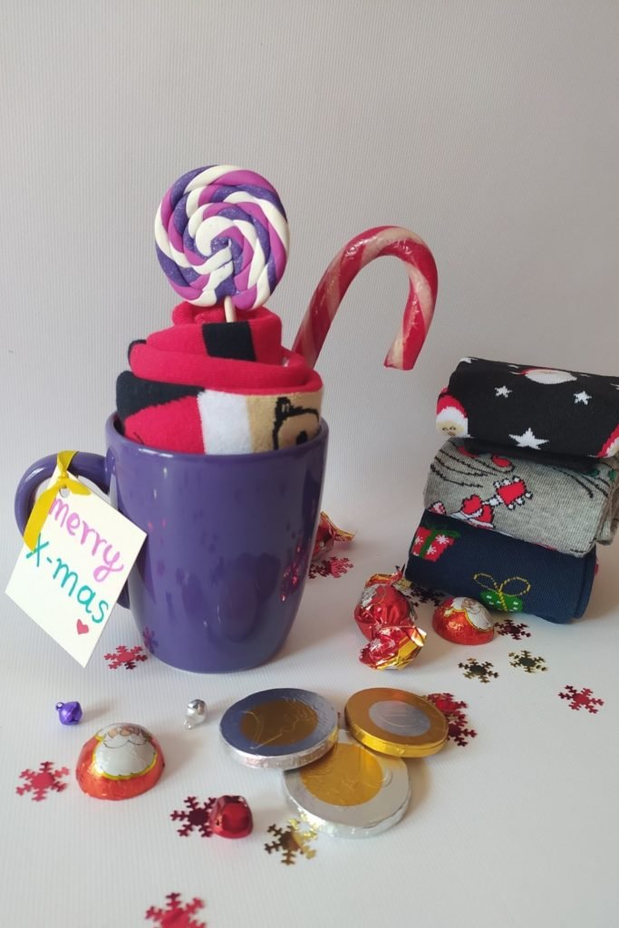 Ας δούμε ακόμα έναν πρωτότυπο τρόπο να προσφέρετε τις χριστουγεννιάτικες κάλτσες που αγοράσατε για αγαπημένα πρόσωπα. Θα χρειαστείτε μία κούπα (όχι απαραίτητα χριστουγεννιάτικη, ένα ζευγάρι κάλτσες, ένα γλειφιτζούρι (το δικό μας το είχαμε φτιάξει από πολυμερικό πηλό και από πίσω είχε μαγνητάκι), ένα ζαχαρωτό μπαστουνάκι (candy cane), μια καρτούλα με ευχές και μία λεπτή κορδέλα.